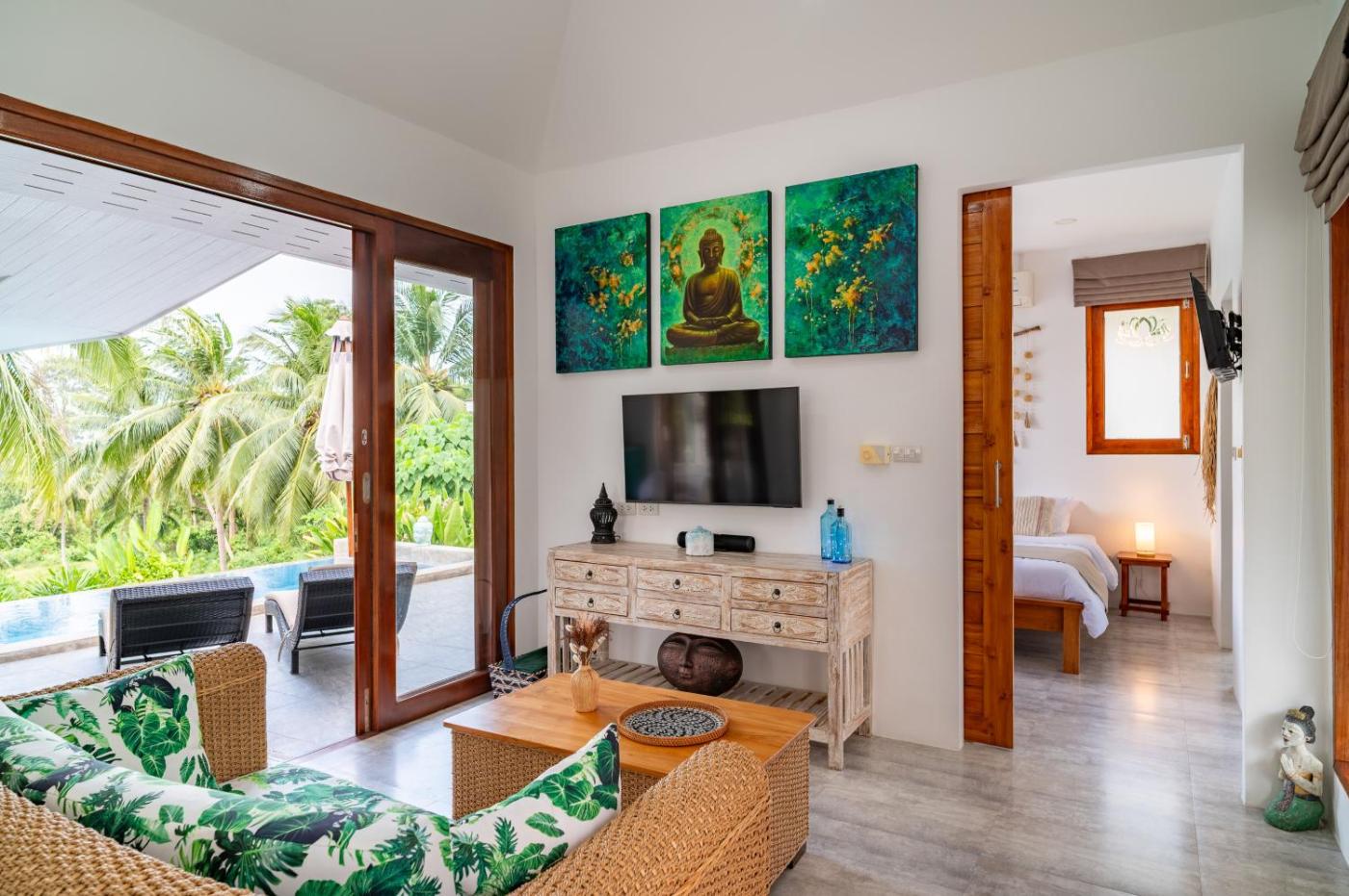 Two-Bedroom Villa. Guests will have a special experience as the villa features a pool with a view. Featuring a private entrance, this air-conditioned villa consists of a kitchen, 2 bedrooms and 2 bathrooms with a walk-in shower and a hairdryer. In the fully equipped kitchen, guests will find a stovetop, a refrigerator, kitchenware and an oven. Boasting a terrace with garden views, this villa also provides a tea and coffee maker and a flat-screen TV with streaming services. The unit offers 2 beds.