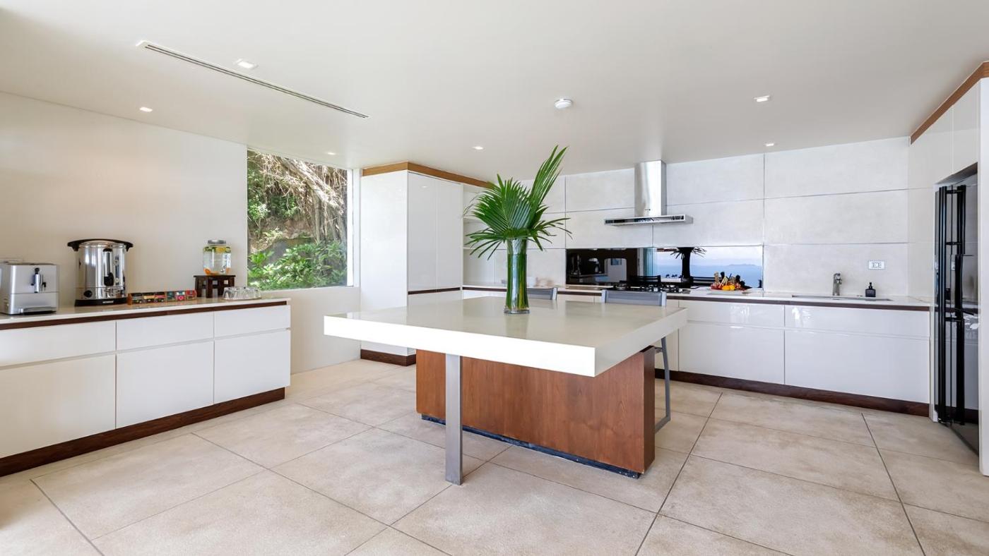Three-Bedroom Villa. This villas standout features are the infinity pool and hot tub. Featuring a private entrance, this spacious villa also consists of 3 bedrooms, a seating area and 4 bathrooms with a bath and a shower. Guests will find a stovetop, a refrigerator, a dishwasher and kitchenware in the fully equipped kitchen. The villa also offers a barbecue. The air-conditioned villa provides a flat-screen TV with streaming services, a washing machine, a tea and coffee maker, a dining area as well as sea views. The unit offers 3 beds.